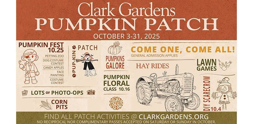 Admission: General admission rates apply. Additional fees apply for pumpkin purchases. Tickets may be purchased in advance online or at the time of the visit at Clark Gardens. Additional fees apply for pumpkin purchases and some activities. No reciprocal admissions nor one time complimentary passes will be accepted on Saturdays or Sundays in October.